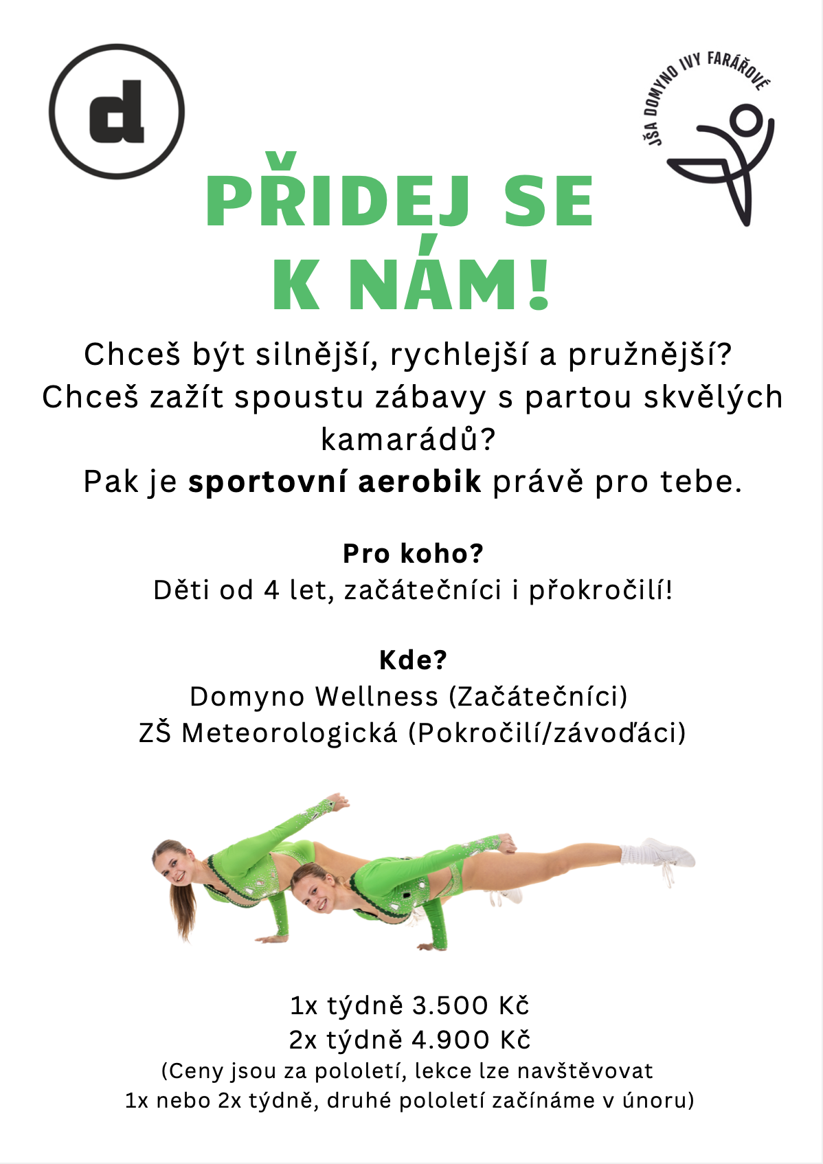 Zároveň máme otevřené i lekce aerobiku v Domyno Wellness, které jsou vedeny kroužkovou formou, tzn. 1-2 týdně bez závodů. Na těchto lekcí děti získávají skvělý sportovní základ a pokud někoho aerobik chytne a chtěl by se mu věnovat více, má možnost přestupu do závodního aerobiku.
